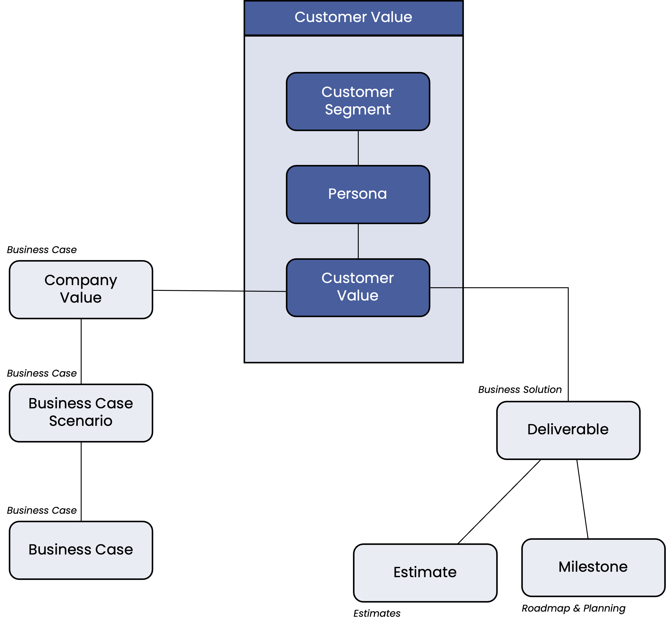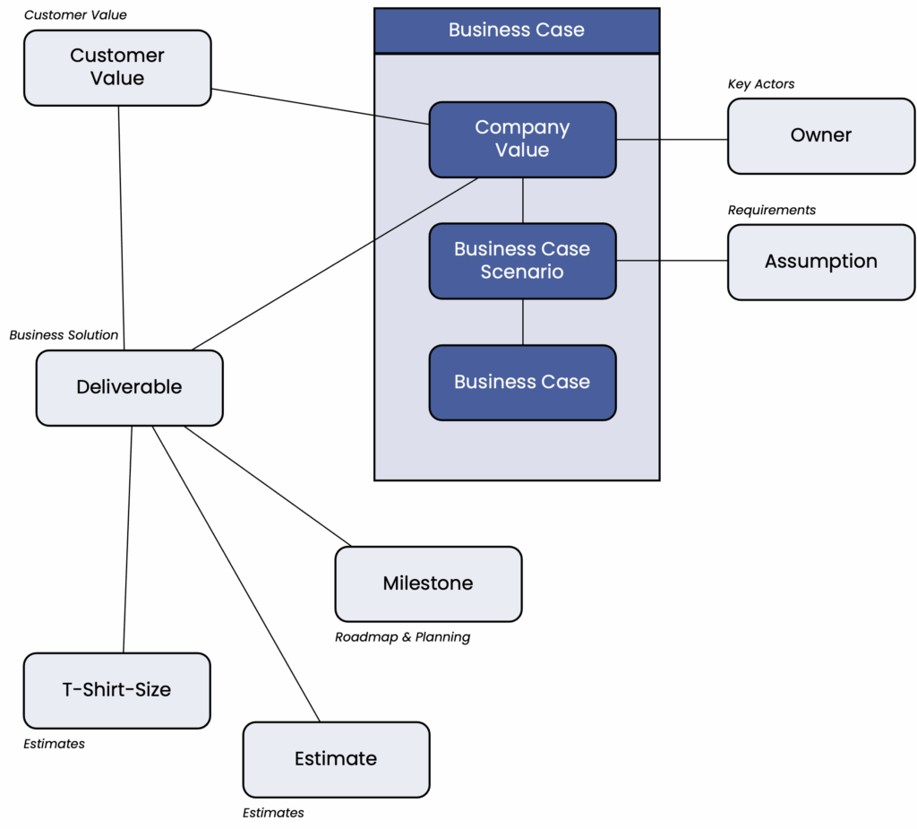 The business case is developed as the result of the scenario assessment phase. It is linked, on the one hand, to the expected values for the company and customers, and, on the other hand, to the project’s outcome—i.e., the deliverables with their associated costs, and schedule.