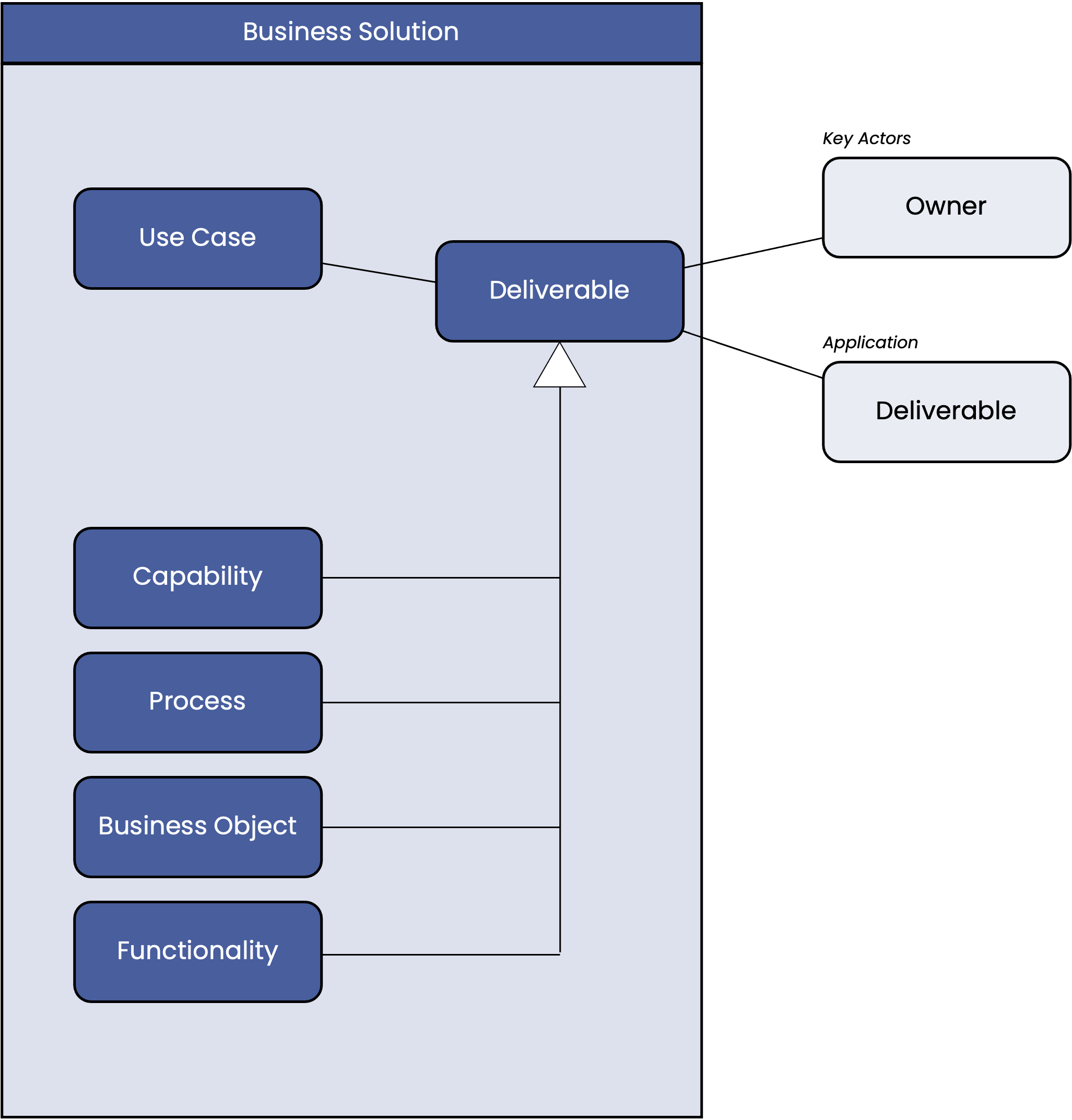 In the “Business Solution” section, we describe use cases, processes, business objects, capabilities, and functions. Not all of these abstractions are relevant to all projects. Instead, we consider those that best fit the nature of a project.
