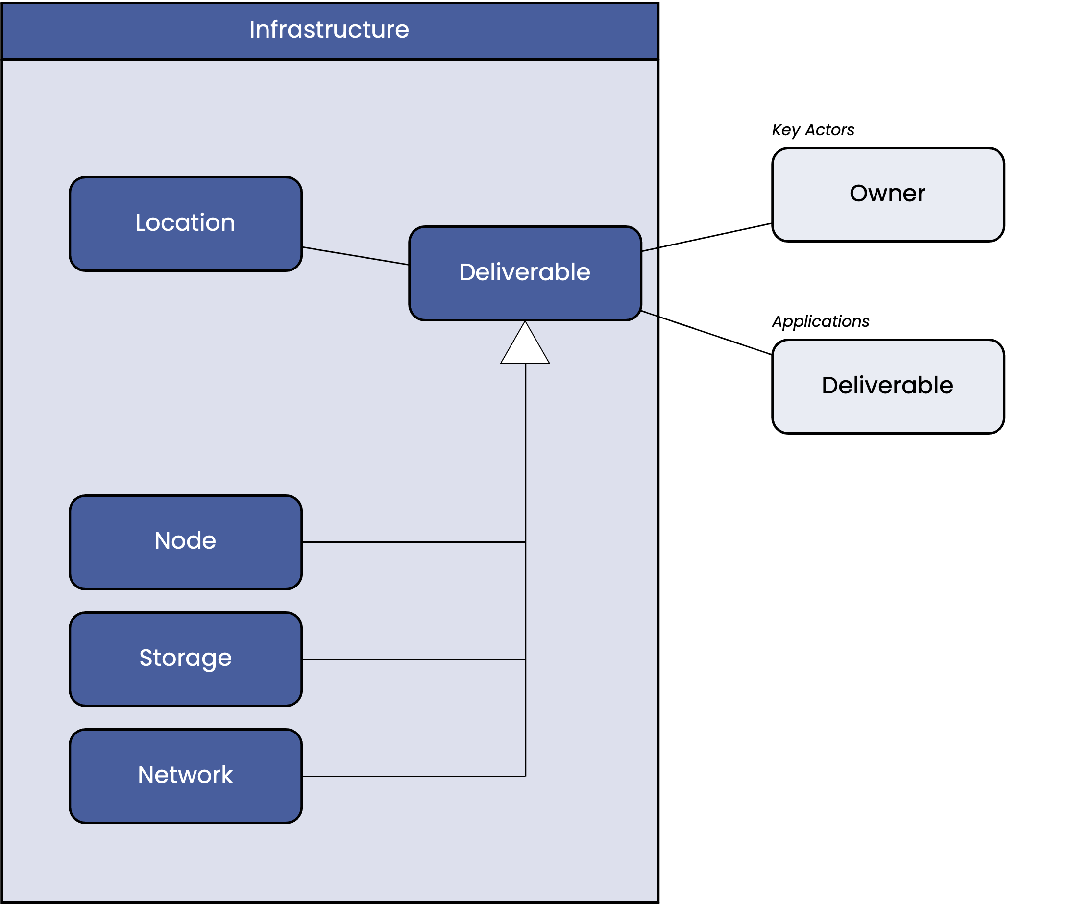 The Infrastructure section describes the physical runtime for the application layer elements of a project, including compute nodes, storage, and networking.