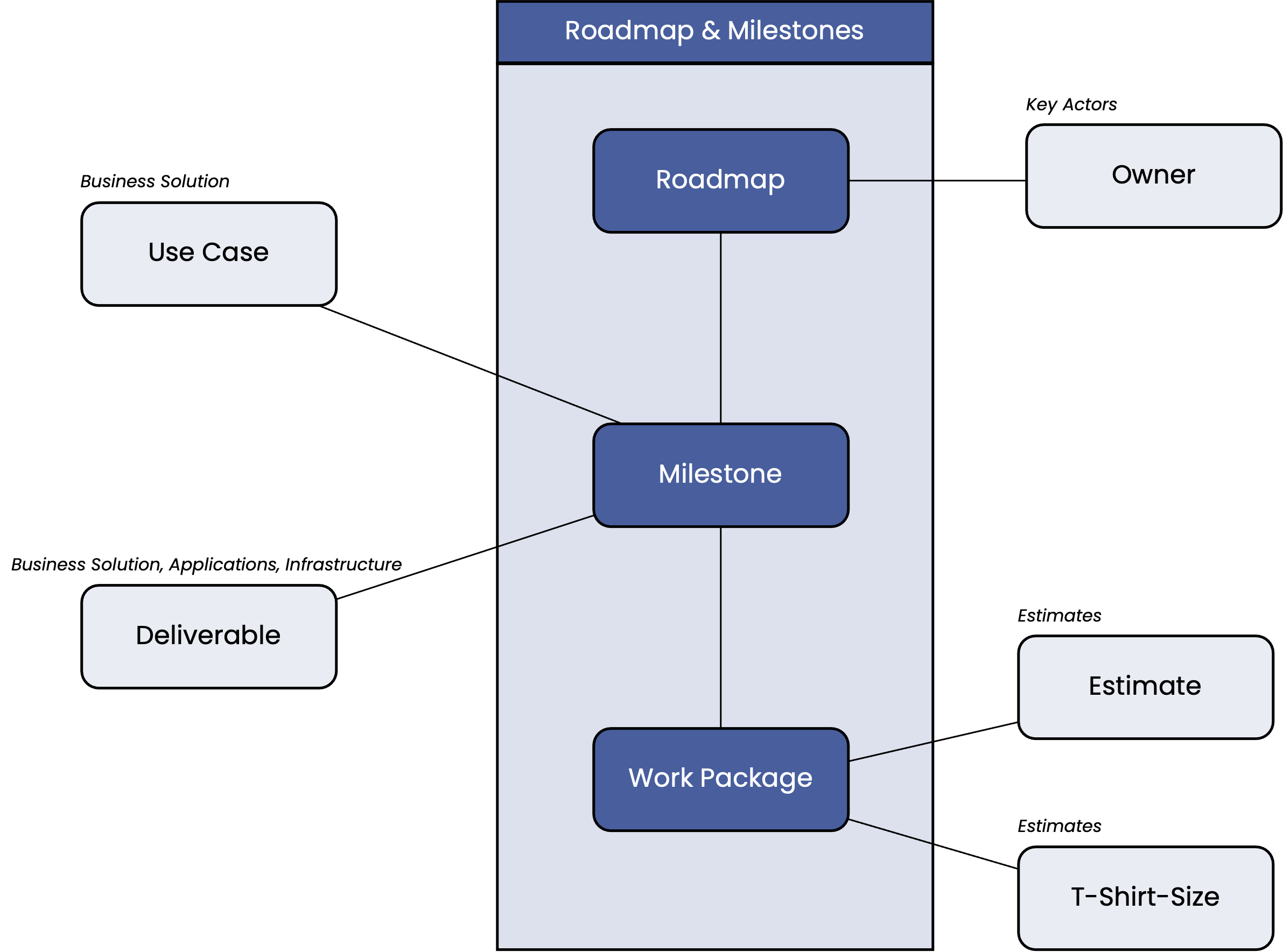 A large project typically includes multiple roadmaps, each with interdependent milestones. For example, one roadmap covers the step-by-step development of a software solution, while a second roadmap describes the rollout of a process across different parts of the organisation that leverages the new software solution. The milestones of both roadmaps are closely linked.