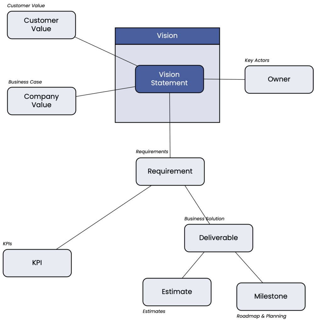 The “Vision” section provides the most compact and concise project description. It summarizes the value the project offers to customers and the company.